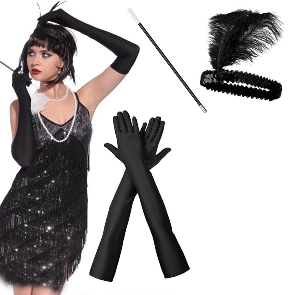 1920'ler Gatsby Aksesuar Seti – Siyah Charleston Saç Bandı, Uzun Eldiven & Sigaralık