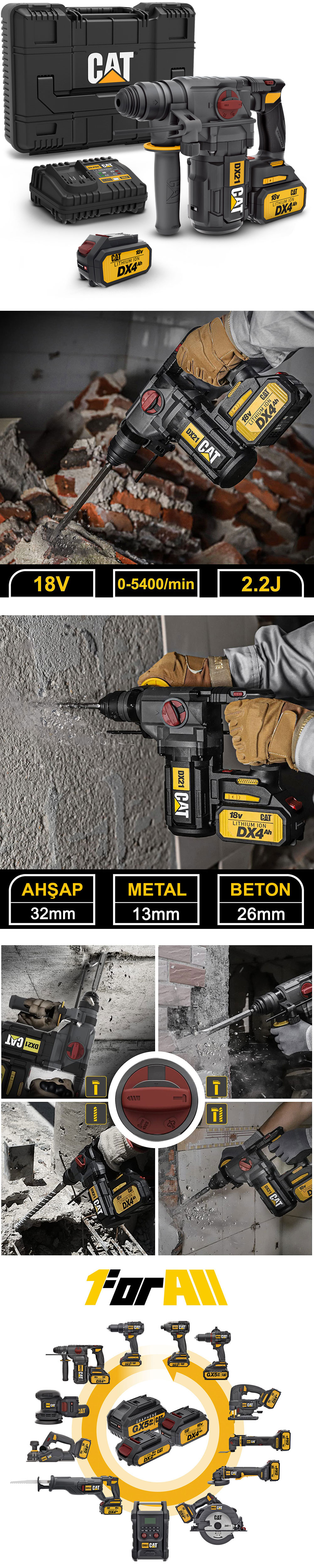 • CAT 1 FOR ALL Li-ion akü teknolojisi sayesinde 18Volt CAT akünüzle tüm 18Volt CAT şarjlı ürünlerini çalıştırabilirsiniz. 18Volt CAT akünüzle yüzlerce CAT şarjlı ürününü çalıştırabilirsiniz.
