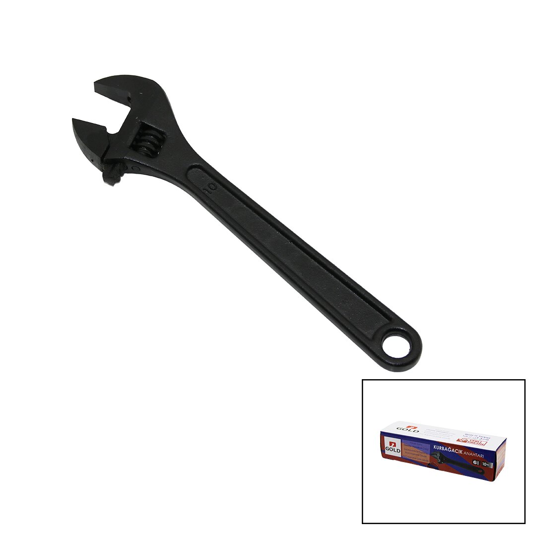 Gold Siyah 10" Kurbağacık Anahtar, dayanıklı chrome vanadium çelik malzemesi ve ergonomik tasarımı ile profesyonel kullanımlar için idealdir. Bu anahtar, çeşitli tamirat ve montaj işlerinde güvenle kullanılabilir.