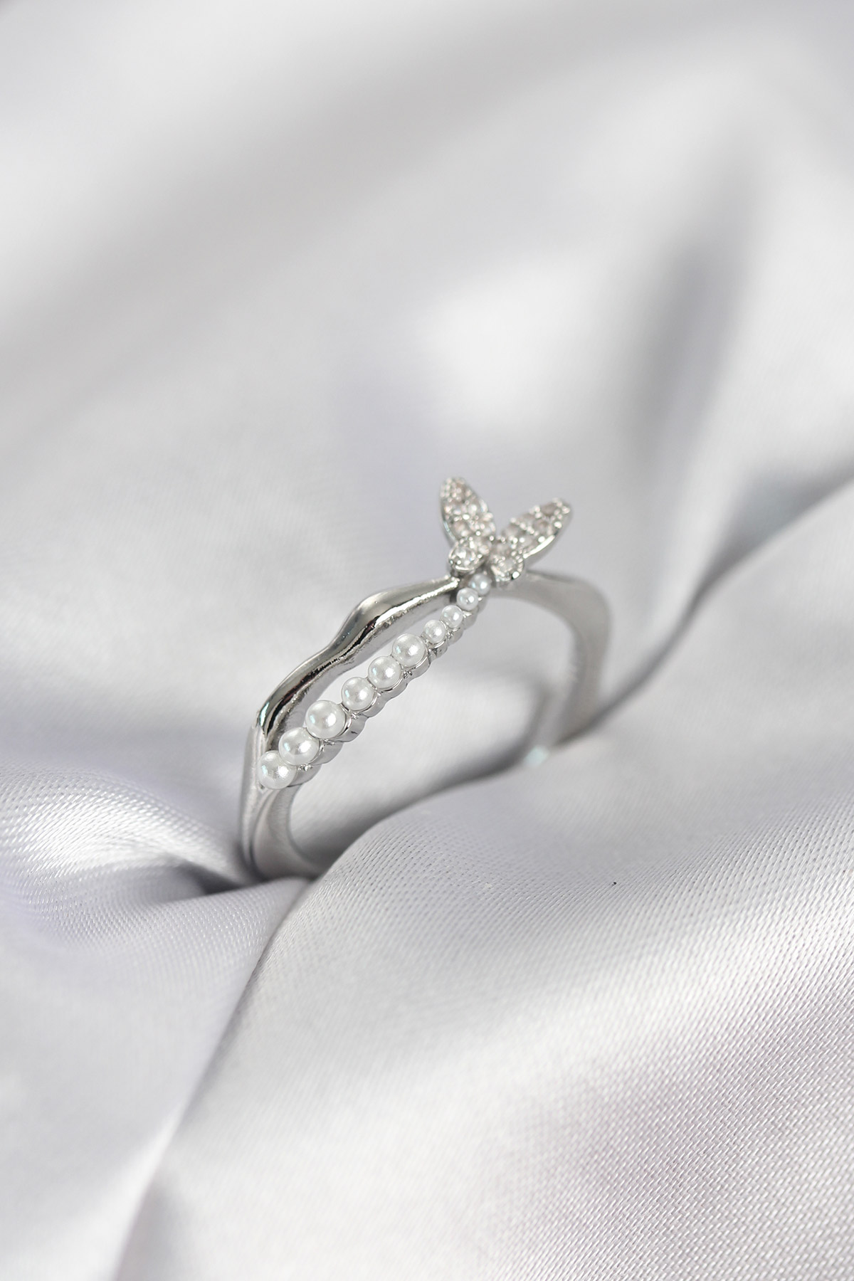 Gümüş Renk Kuyruklu Kelebek Model İncili Kadın Yüzük - TJ-BYK4091 - 130.85 TL