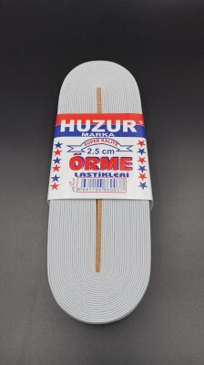 Huzur Beyaz Paça Lastik, 2.5 cm genişliğinde ve 10 metre uzunluğunda bir üründür. Bu lastik, giysi paçalarında kullanılmak üzere tasarlanmıştır ve esnek yapısıyla dikkat çeker.