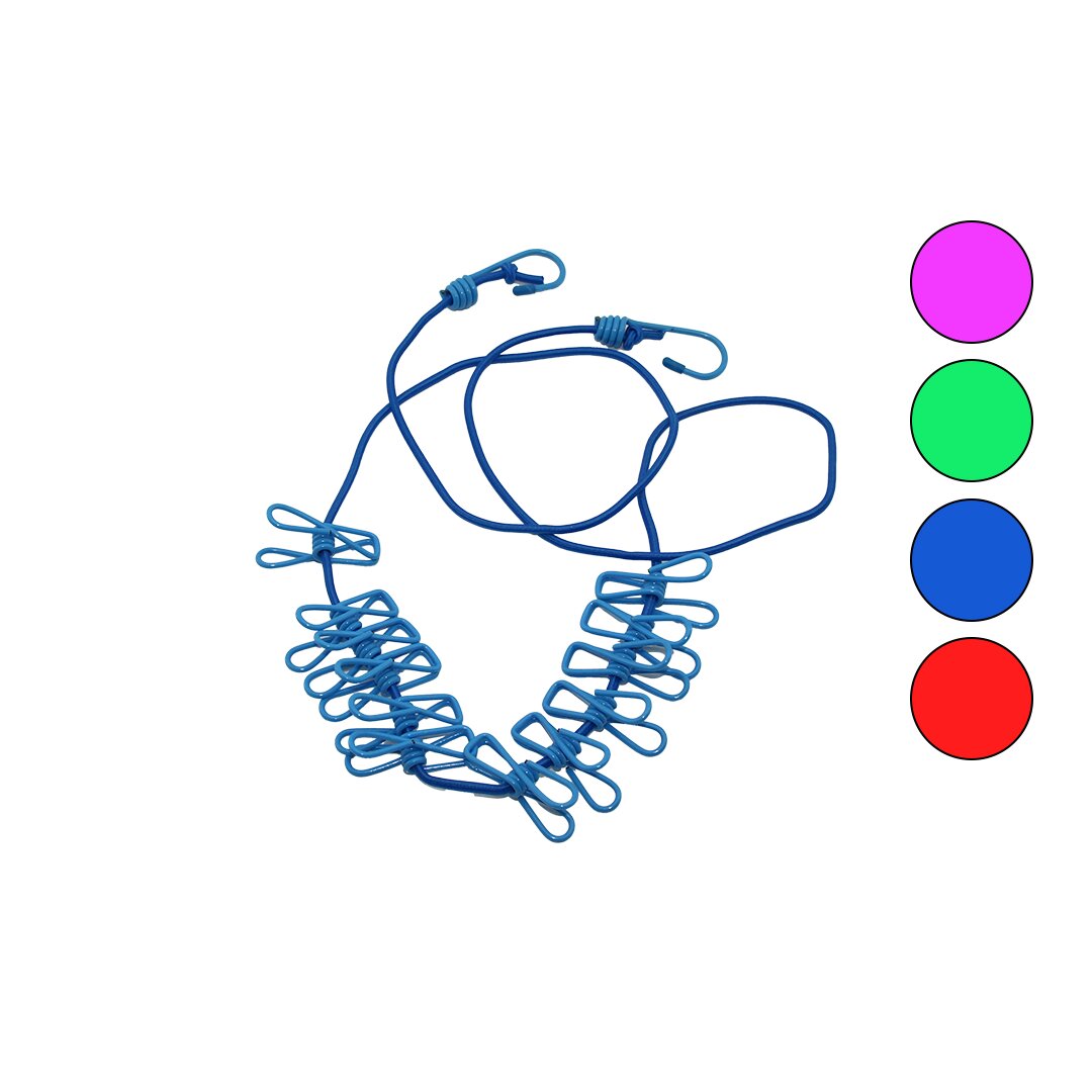 İBİCO İ21-031-İ20-031 Renkli Lastik Çamaşır İpi, 150 cm'den 280 cm'ye kadar uzayabilen yapısıyla esnek bir kullanım sunar. 12 adet metal mandalı ile çamaşırlarınızı güvenle asabilirsiniz.