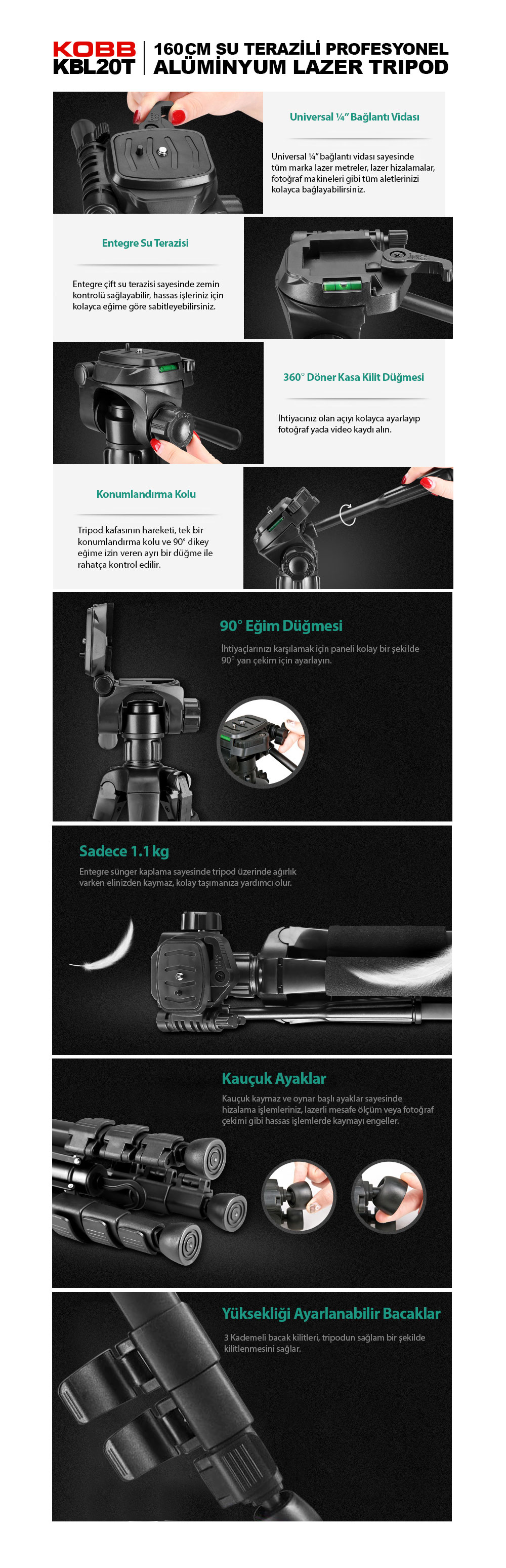 • Sağlam alüminyum yapı sayesinde Lazer hizalama, Lazer metre, Fotoğraf Makinesi, Aksiyon kamerası vb. tüm Tripod bağlantısı olan ekipmanlarınızla kolayca kullanabilirsiniz.