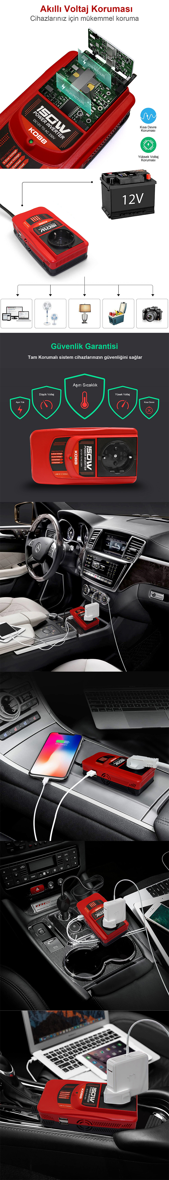 · Çoklu Güvenlik Koruması: KBN150 İnvertör, Düşük giriş akım koruması, yüksek giriş akım koruması, aşırı yük koruması, aşırı sıcaklık koruması ve çıkış kısa devre koruması olmak üzere 5 farklı koruma teknolojisine sahiptir, bu koruma özellikleri sayesinde hem aracınıza zarar vermez hem de invertörünüzü güvenle kullanmanızı sağlar.