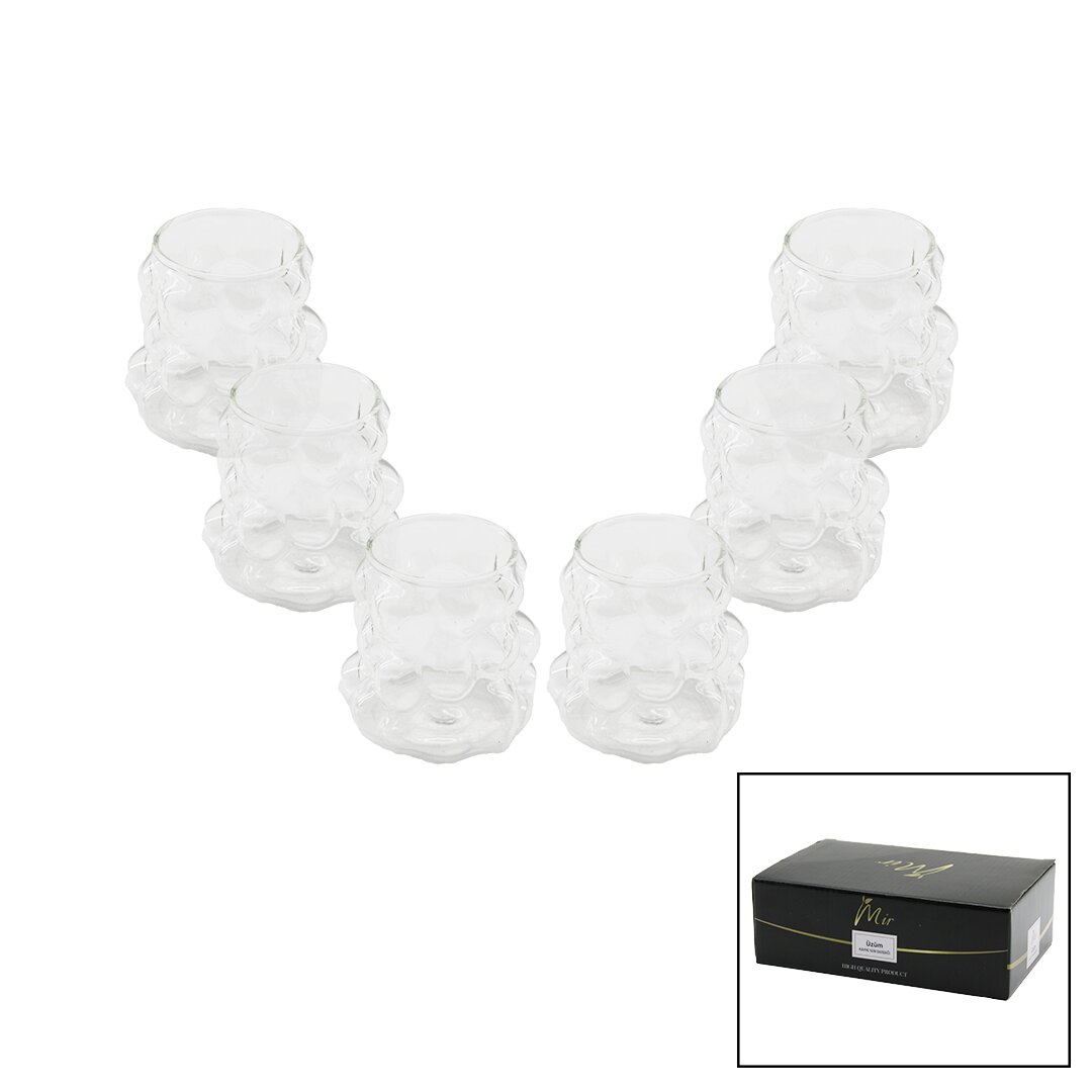 MİR-1539 Üzüm ve Kabarcıklı Cam Kahve Yanı Bardak seti, 90ml kapasitesi ile kahve keyfinizi tamamlamak için tasarlanmıştır. Zarif tasarımı ve kaliteli cam malzemesi ile dikkat çeker.
