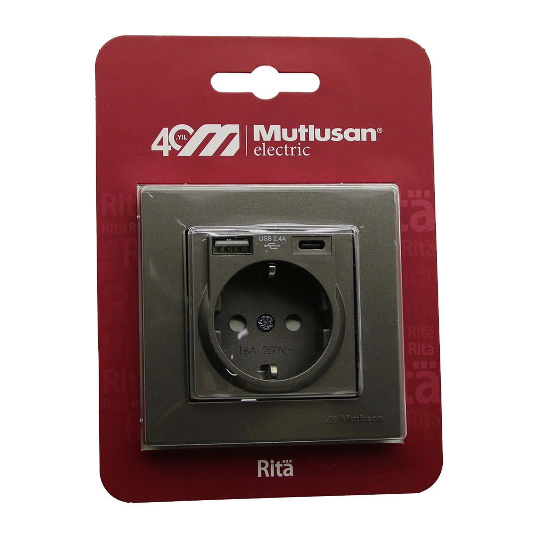 Mutlusan Rita-2220 629 0286, antrasit renkli ve USB ile Type-C bağlantılarına sahip topraklı priz modelidir. Modern ve sofistike bir tasarıma sahiptir.