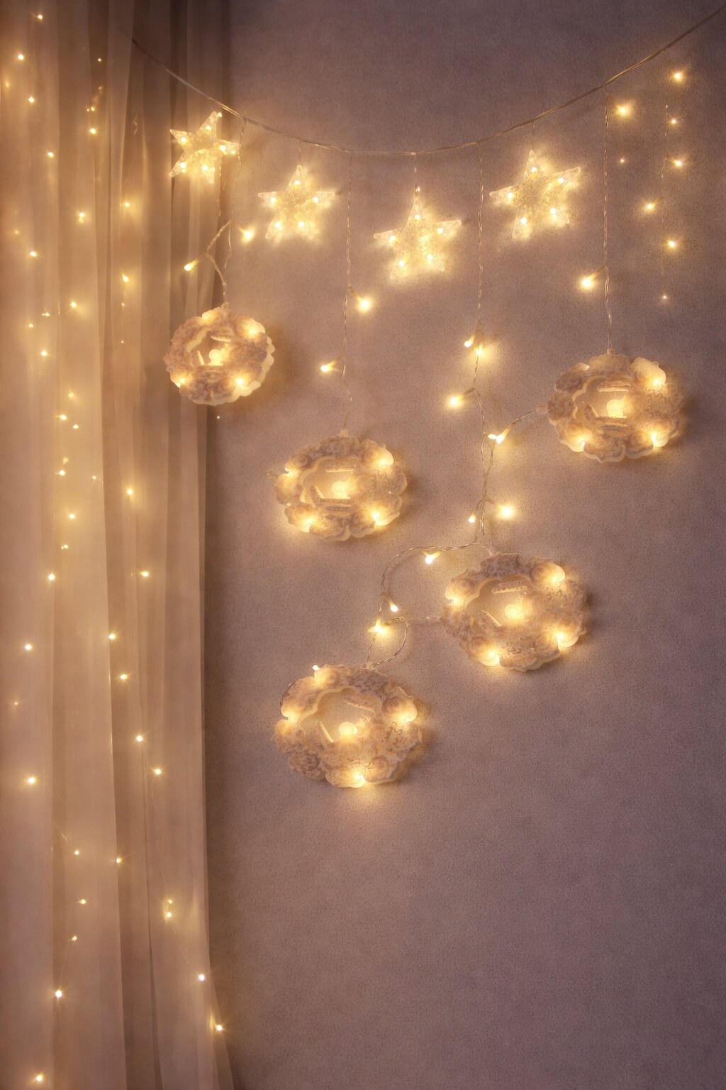 WINNBOSS EKL-09-04 modeli, sarı ve beyaz yuvarlak cami ve yıldız motifleriyle tasarlanmış özel bir dekoratif lamba ve perde LED setidir. Ramazan ayının manevi atmosferini evinize taşımak için mükemmel bir seçimdir.