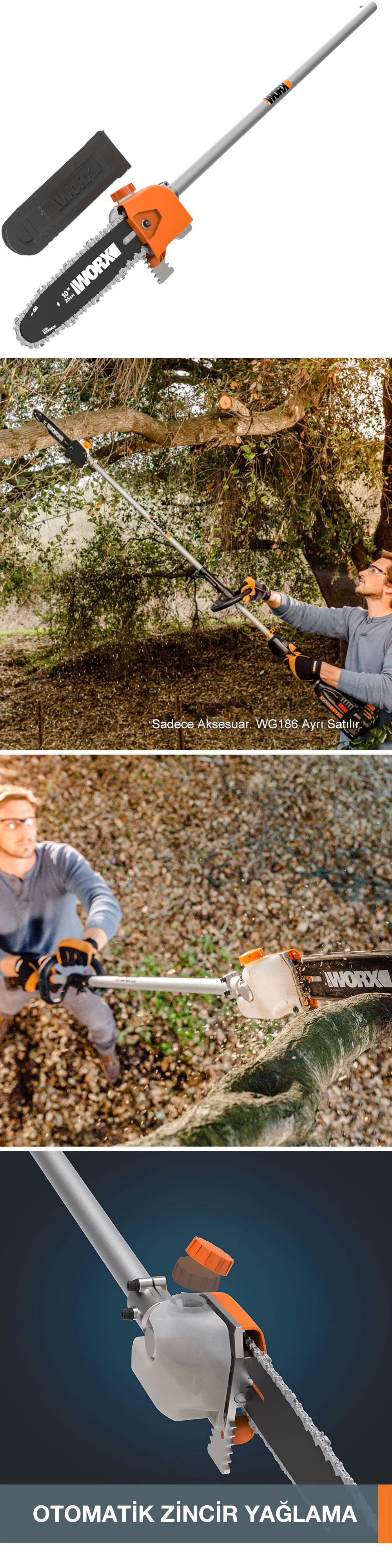 · WORX WA0222 WG186E.1 ile Uyumlu 25CM Teleskobik Uzatmalı Zincirli Dal Budama Başlığı