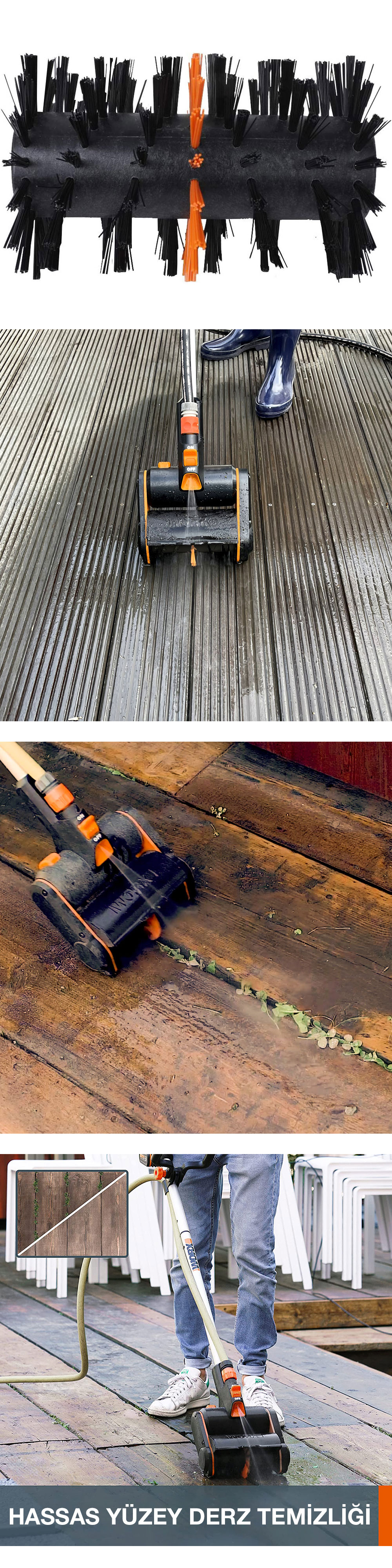 · Kaldırım taşlı yolların temizliğinde, beton ve ahşap veranda zeminlerinde, havuz ve açık alan fayanslarındaki derz aralarında oluşan yosunların derinlemesine temizliğinde üstün temizleme performansı sağlar.