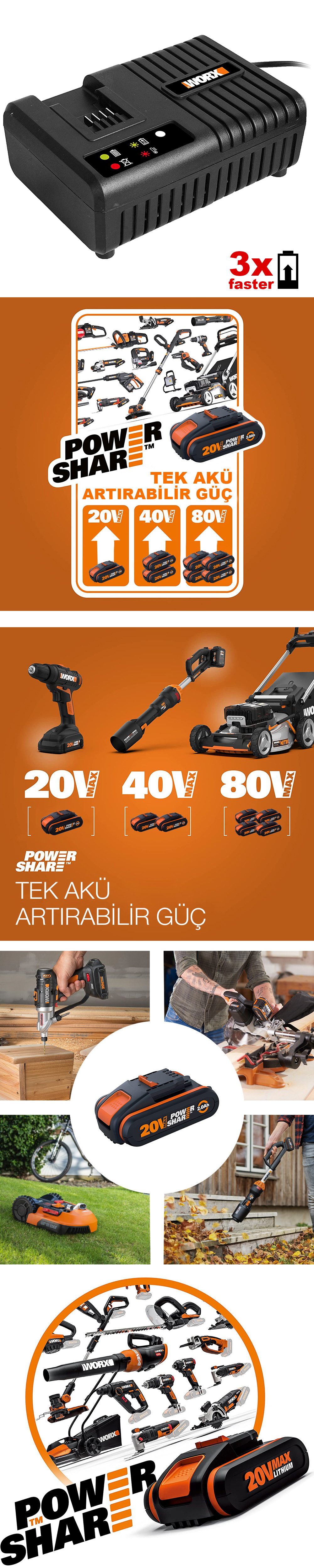 · Worx 20Volt Li-ion PowerShare Aküler ile uyumlu akü şarj aleti amper değeri gözetmeksizin 20Volt akülerinizi hızlı şarj eder.