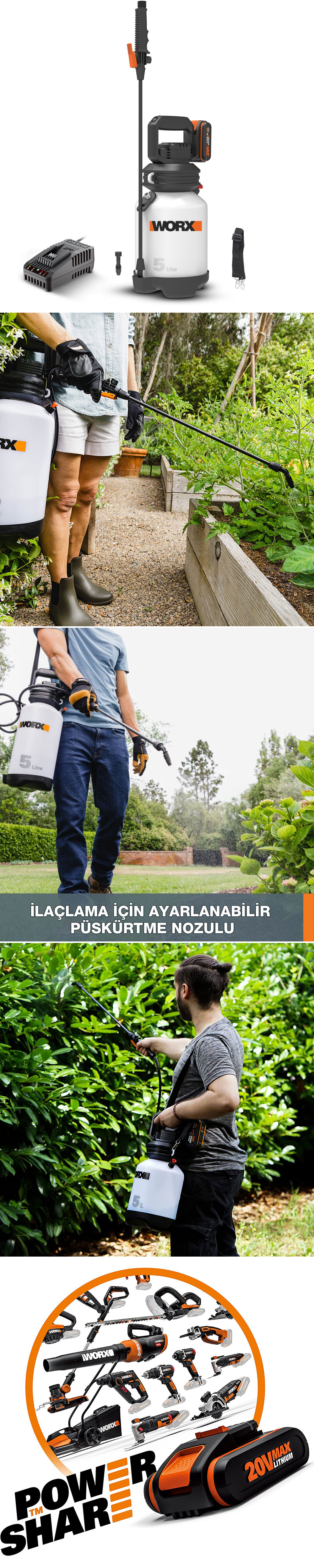· WORX WG829E 20Volt 2.0Ah. Li-ion 5Lt. Omuz Askılı Basınçlı İlaçlama ve Dezenfektan Pompası