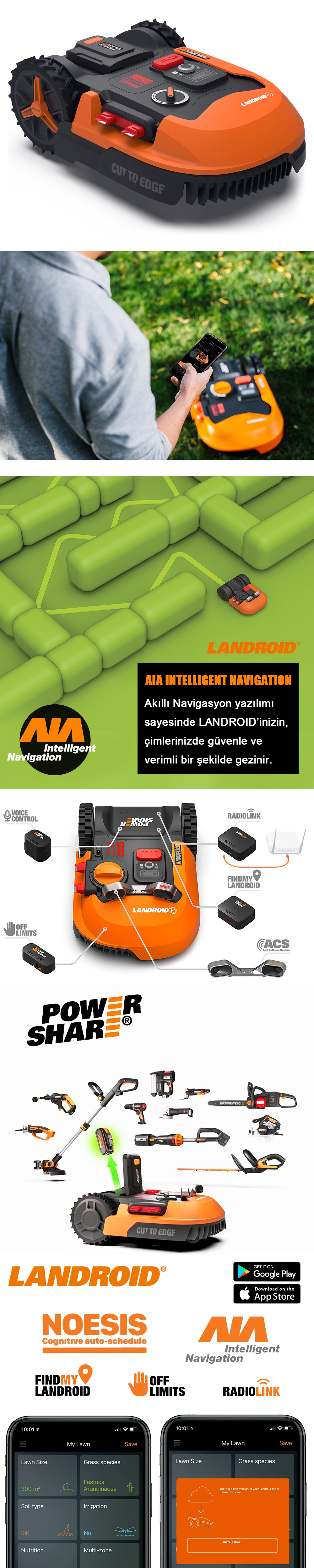 · AIA INTELLIGENT NAVIGATION Akıllı Navigasyon yazılımı sayesinde LANDROID’inizin, çimlerinizde güvenle ve verimli bir şekilde gezinir. LANDROID’iniz belirlenmiş sınır içerisinde gereksiz manevralar yapmaz ve çimlerinize zarar vermez. Rastgele gezinen diğer çim biçme makinelerinin aksine, akıllı yazılımı sayesinde, her alandan sadece bir defa geçerek çimlere zarar vermeden tam otonom çalışır.