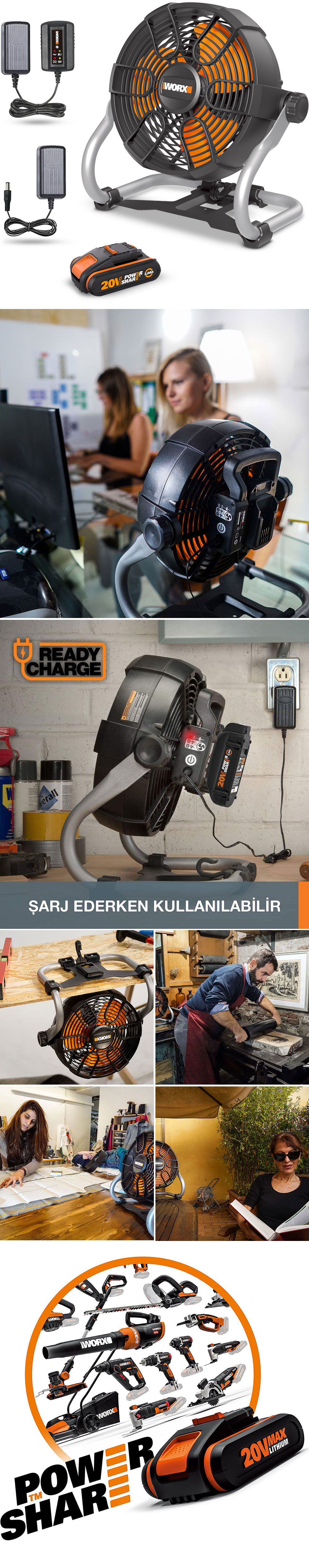 · WORX WX095 20Volt 2.0Ah. Li-ion 242mm Profesyonel Hibrit Şantiye Fanı/Vantilatör