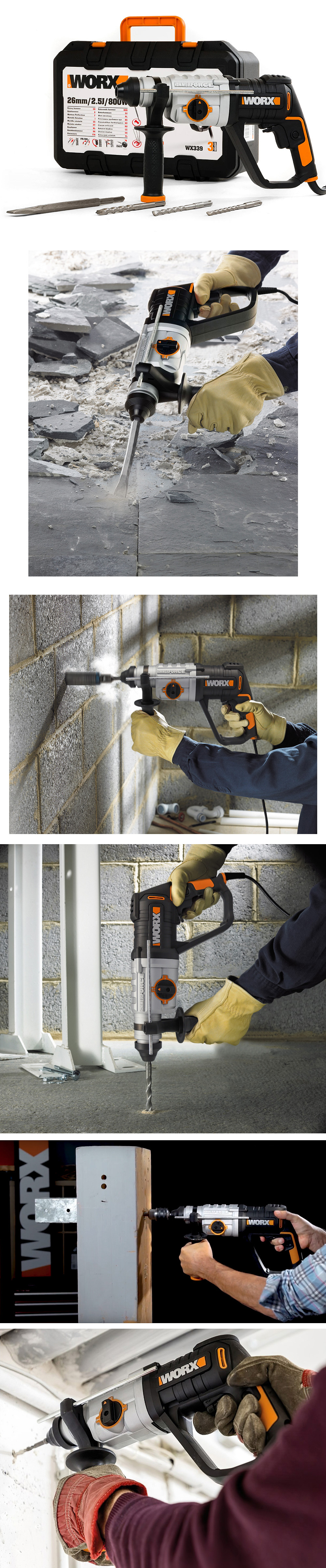 · WORX WX339 800Watt 2.5J Profesyonel SDS-Plus Kırıcı/Delici + 4 Adet Uç