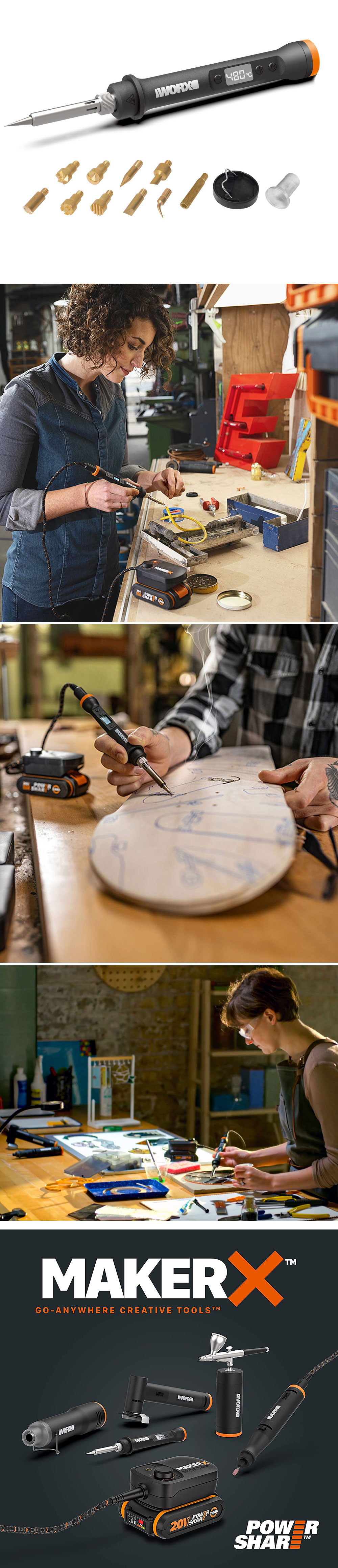 · WORX WX744.9 MAKERX 20Volt Profesyonel Dijital Lehim Tabancası + 12 Aksesuar (Akü Dahil Değildir)