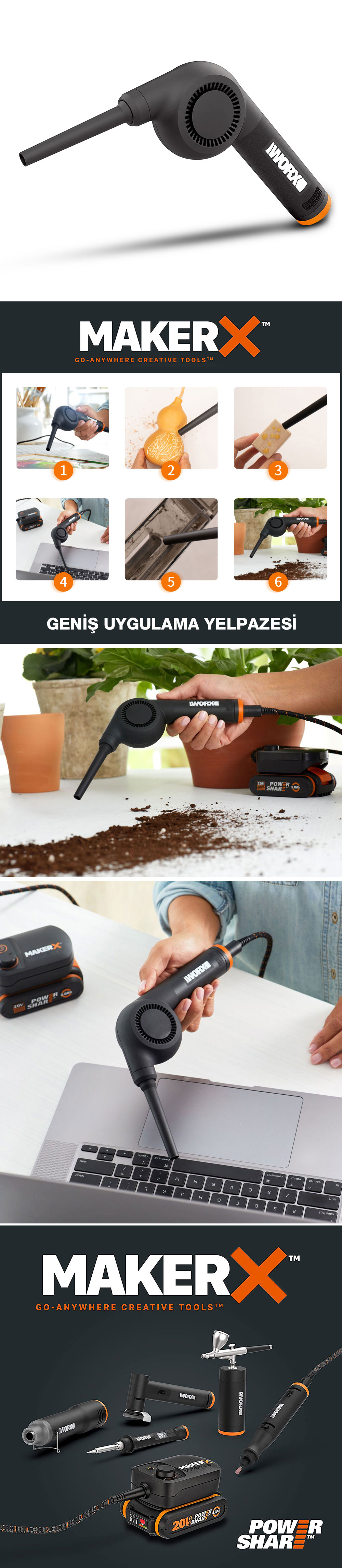 · Akü ve Şarj cihazı hariç satılan tüm MAKERX serisi ürünleri amper değeri fark etmeksizin satın alacağınız 20Volt WORX akü, şarj cihazı ve WA7160 veya WA7161 HUB-HUBX ayarlanabilir güç kaynakları ile kullanabilirsiniz.